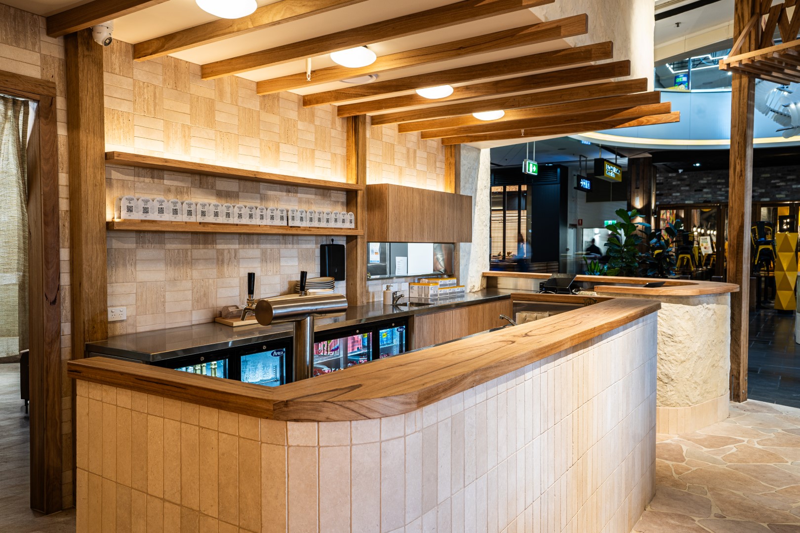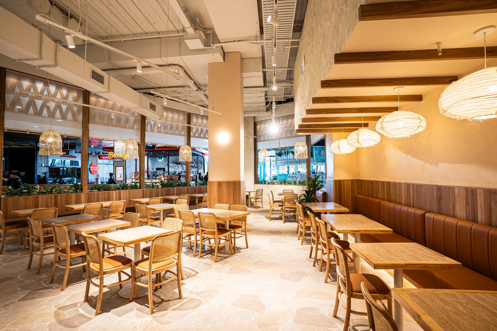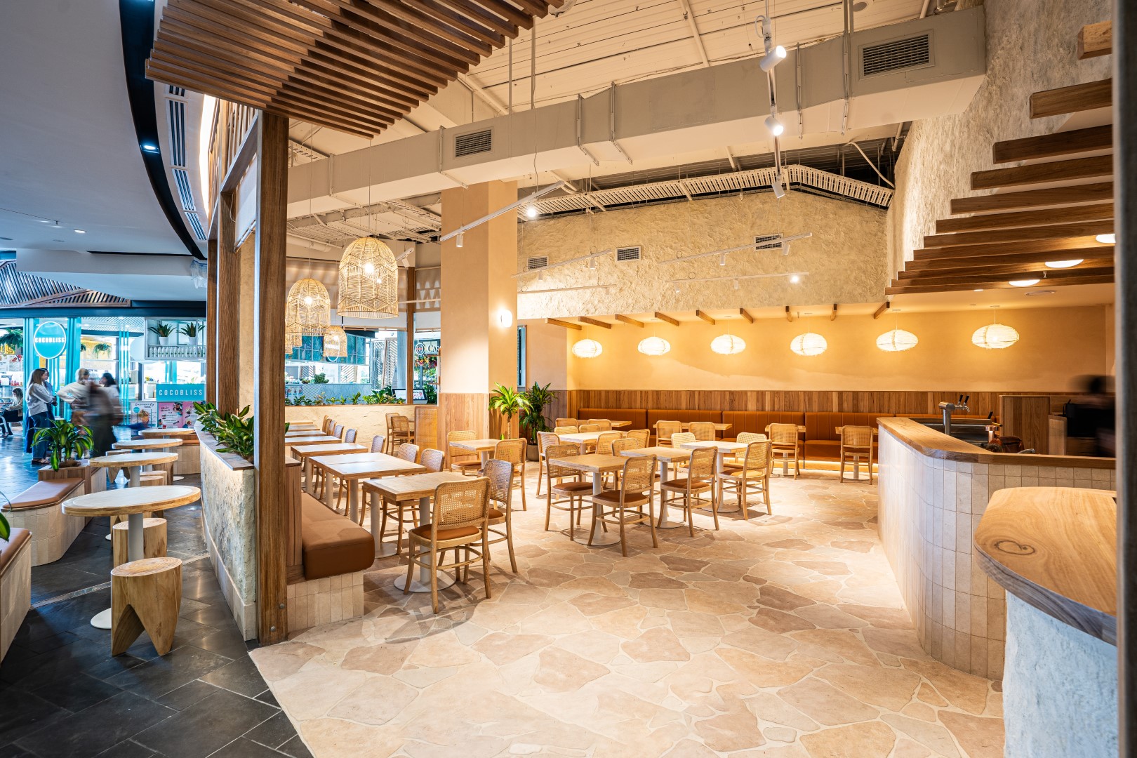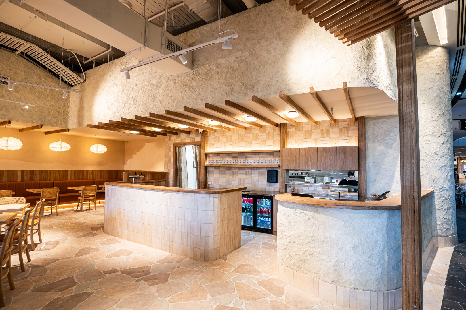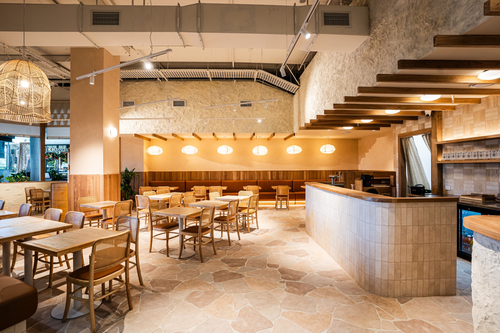 The space feels lively without being loud, balancing intimacy and scale through considered detailing and repetition of natural materials.