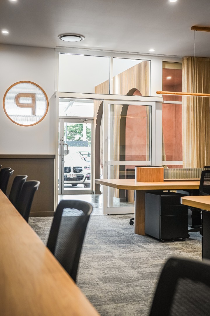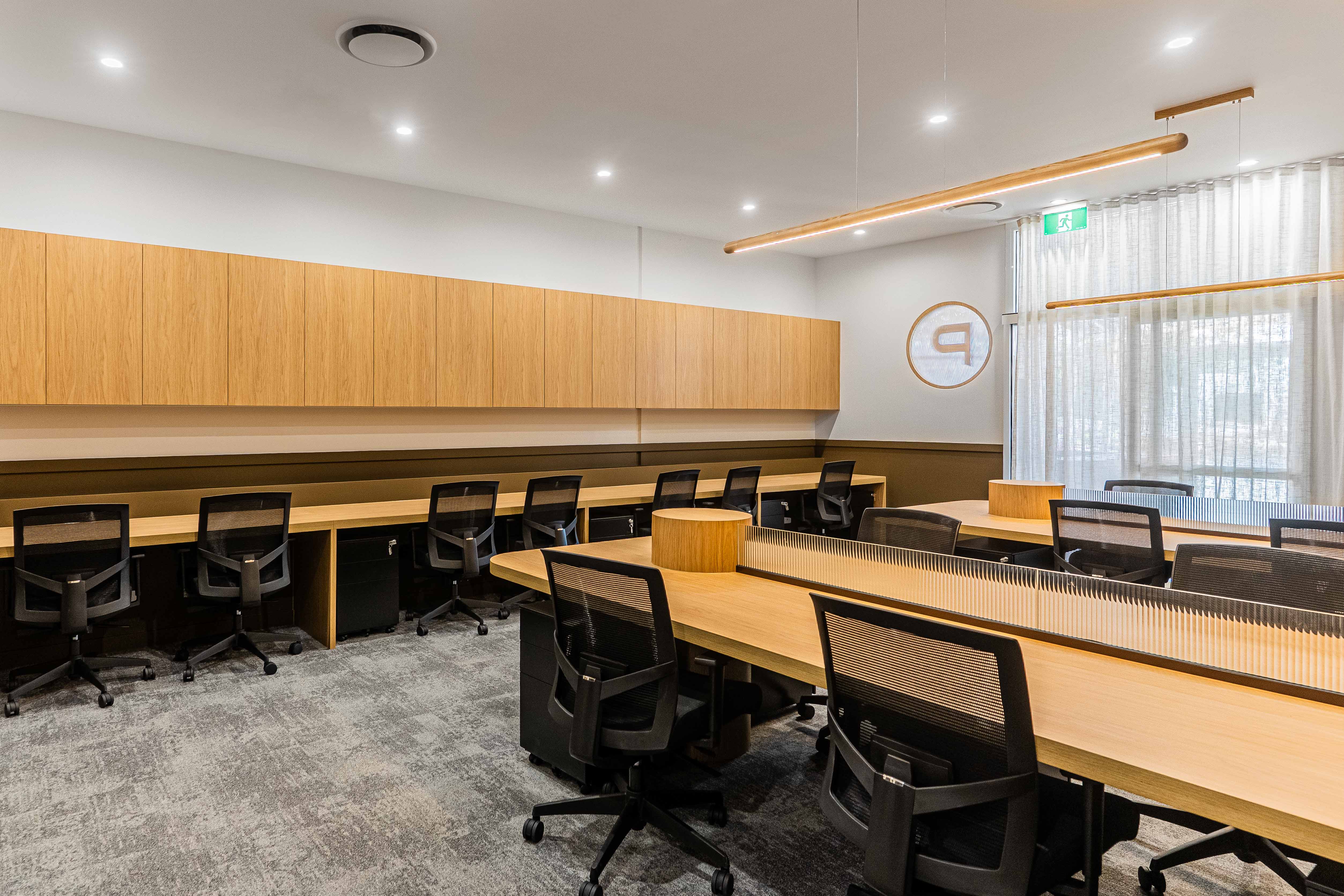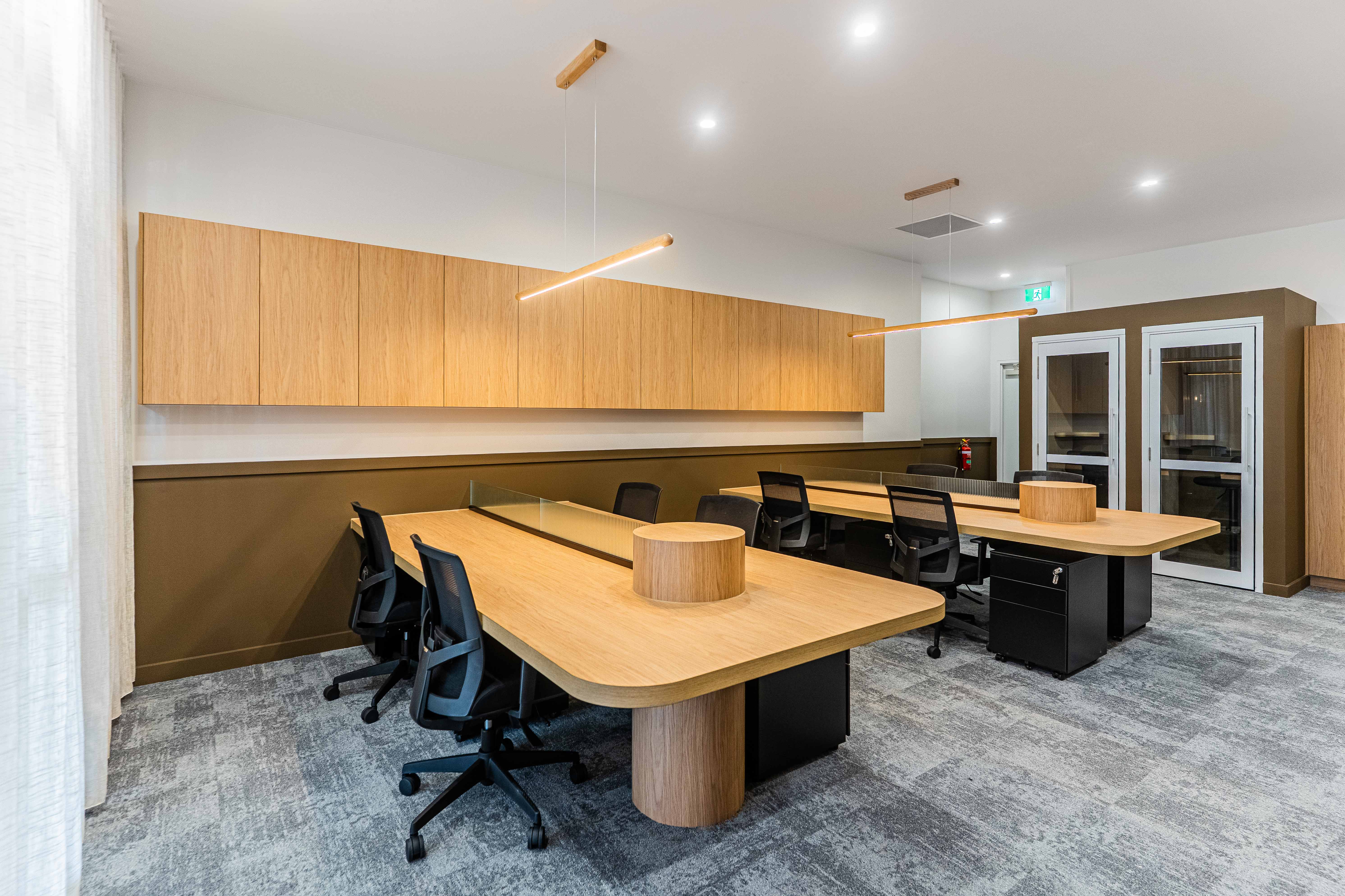 Captured by Kehoe Studio, this office fit-out at Place Cannon Hill brings together warm timber finishes, soft lighting, and clean lines to create a space that feels considered but approachable.
