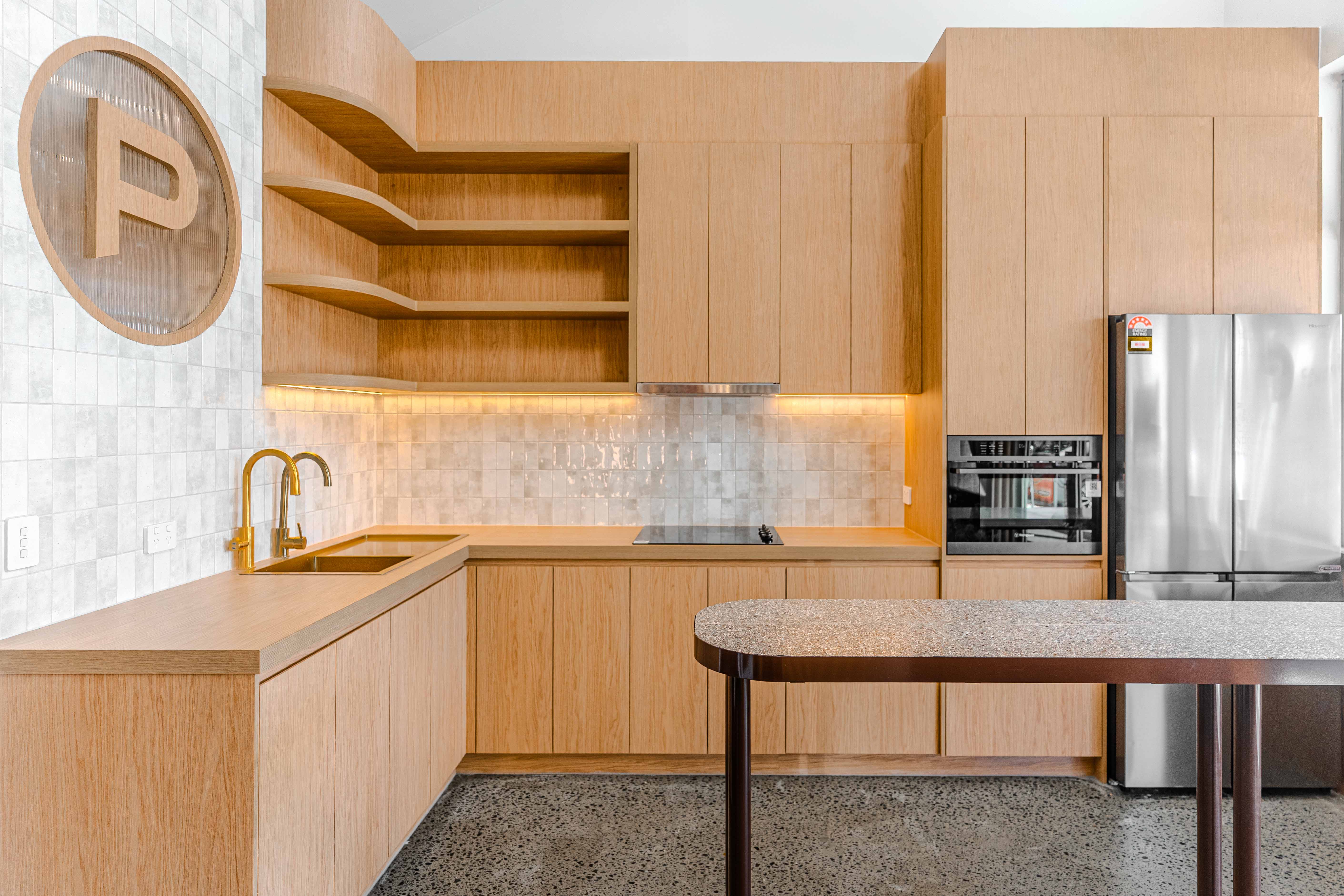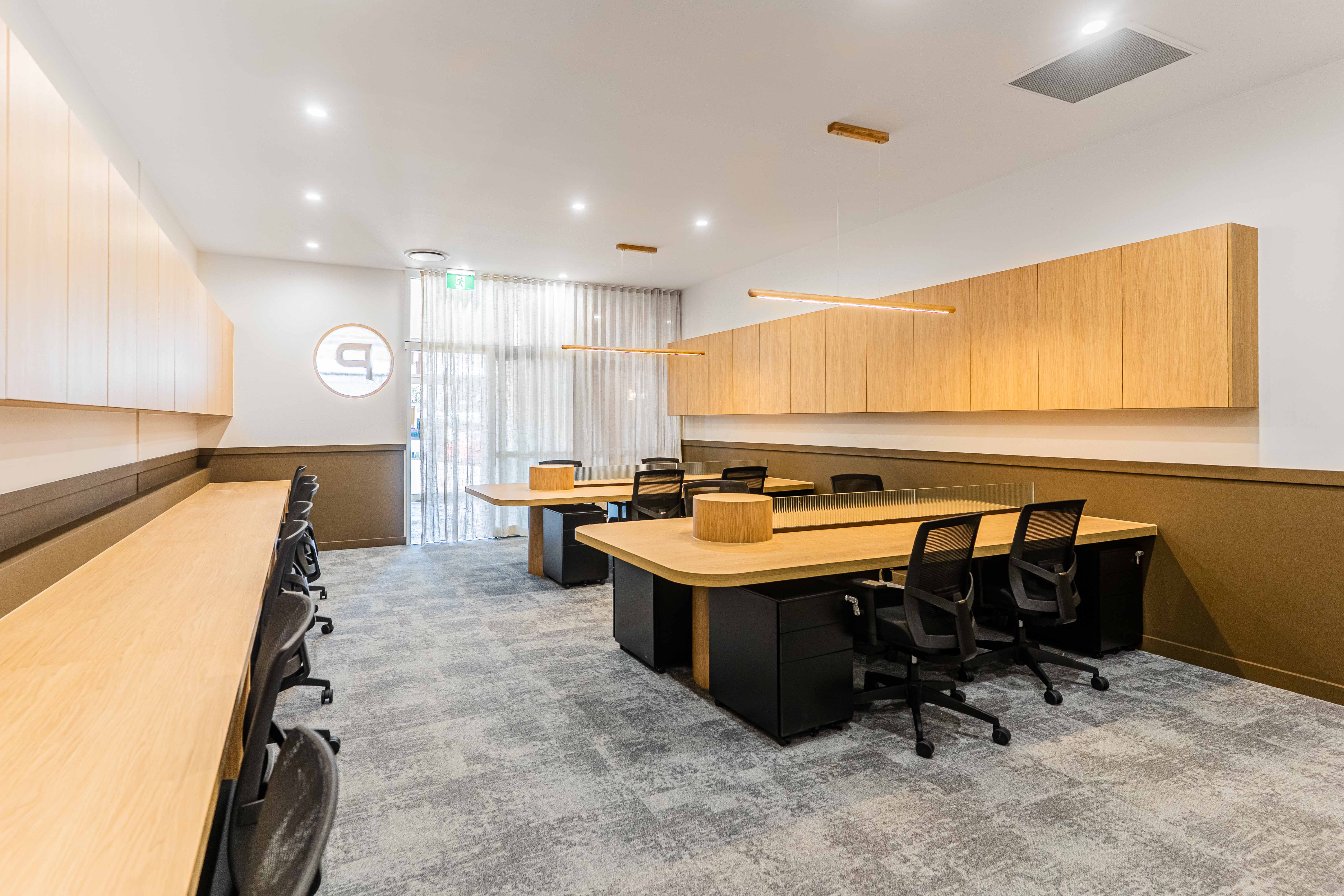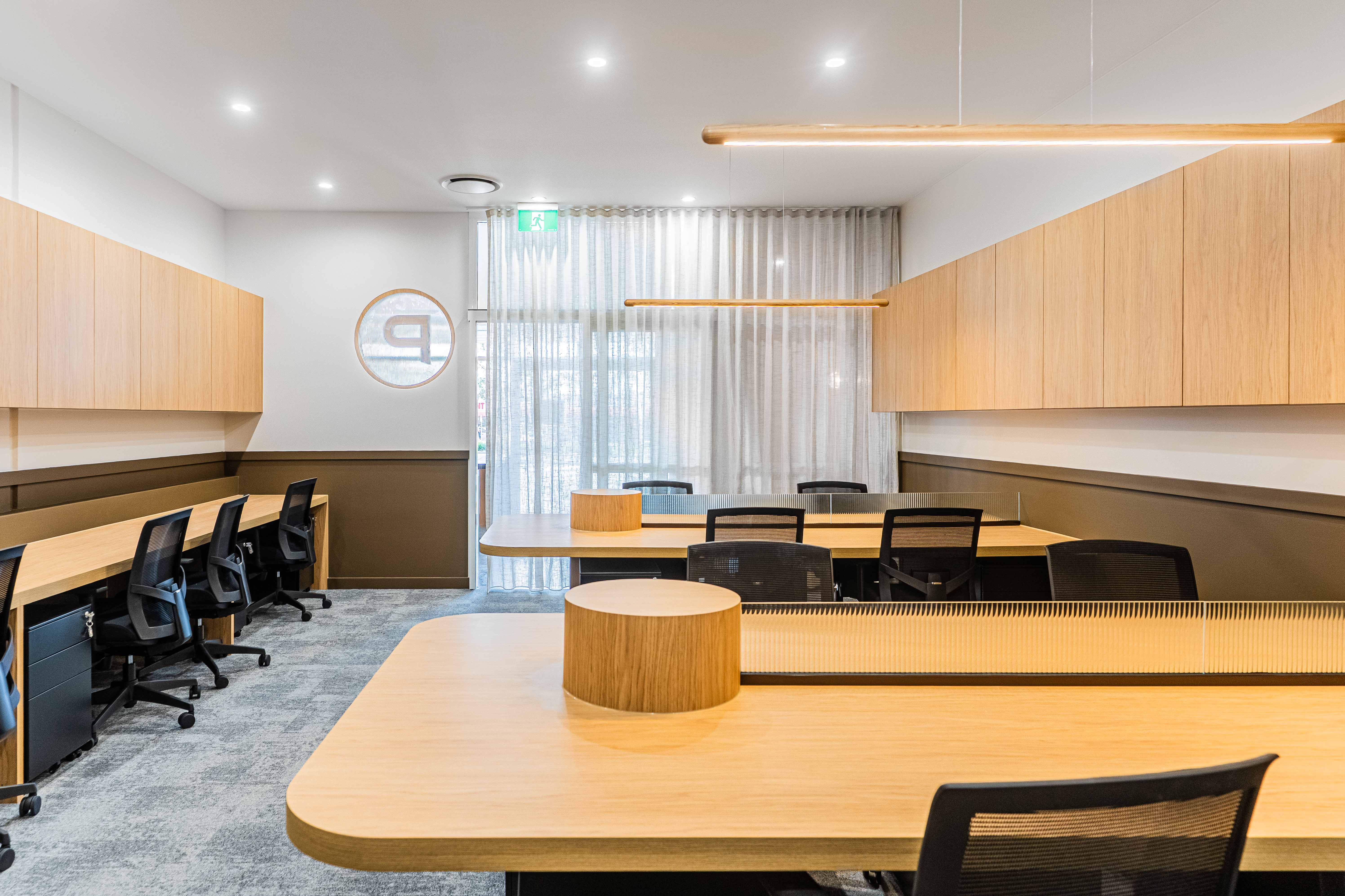 Captured by Kehoe Studio, this office fit-out at Place Cannon Hill brings together warm timber finishes, soft lighting, and clean lines to create a space that feels considered but approachable.